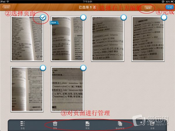 單個文檔中每個頁面的管理功能:打開某個文檔,選擇右上方的編輯,然后選擇具體的頁面,再選擇下面的選項(xiàng)可對單張頁面進(jìn)行移動/復(fù)制,刪除等操作!
