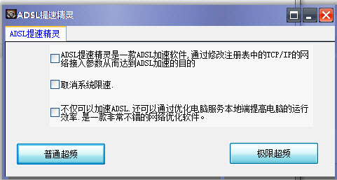 ADSL提速精靈為ADSL專用的寬帶上網(wǎng)加速軟件. 通過(guò)修改PC系統(tǒng)注冊(cè)表中原來(lái)被系統(tǒng)限制低速的 TCP/IP 參數(shù)來(lái)進(jìn)行ADSL提速.軟件有兩種提速方式供用戶選擇。用戶還可以通過(guò)優(yōu)化電腦服務(wù)本地端提高電腦的運(yùn)行效率,讓你的網(wǎng)絡(luò)得到飛一般的提高。