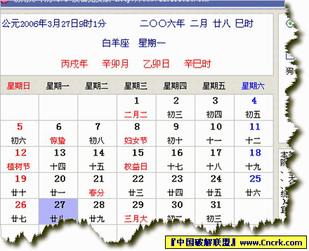 軟件包括陽(yáng)歷、陰歷、閏年、閏月、各種節(jié)日、節(jié)氣(準(zhǔn)確的交節(jié)時(shí)間)、天干地支(四柱八字)、屬相、星座、星期、傳統(tǒng)黃道吉日(黃色)的顯示以及每日宜忌提示等