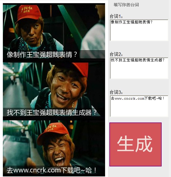 王寶強(qiáng)超賤表情生成器只要打上自已喜歡的臺(tái)詞的加上配上王寶強(qiáng)的超賤表情然后點(diǎn)擊生成就可以啦。不用再擔(dān)心因?yàn)閜hotoshop沒(méi)學(xué)好而不會(huì)處理圖片啦。