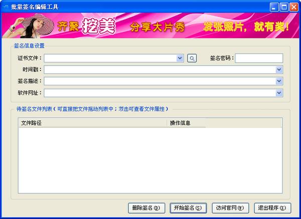 批量簽名編輯工具是一款綠色免費(fèi)的支持批量簽名,和批量刪除簽名功能的軟件。Internet Explorer 的缺省安全設(shè)置要求任何可下載的軟件在下載之前必須擁有一個(gè)數(shù)字簽名。數(shù)字簽名能用于對(duì)以下內(nèi)容進(jìn)行核實(shí): 簽名提供了一種驗(yàn)證文件內(nèi)容的方法,該方法確保該文件在可用于下載后未被改變過(guò)。數(shù)字簽名通過(guò)標(biāo)識(shí)創(chuàng)建軟件的合法實(shí)體來(lái)驗(yàn)證來(lái)源。當(dāng)您在可下載的軟件中加入了簽名,您就是合法實(shí)體。
