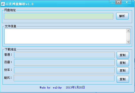 吾愛百度網(wǎng)盤地址解析器是一款綠色免費(fèi)的百度網(wǎng)盤下載工具,通過使用這款軟件,您可以直接將自己需要下載的百度網(wǎng)盤資料的網(wǎng)址復(fù)制到該軟件的網(wǎng)址欄中,然后點(diǎn)擊解析下載即可進(jìn)行下載,操作簡單,而且實(shí)用,值得下載!