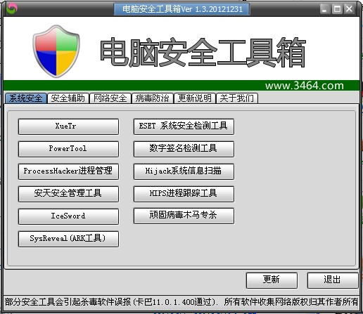 電腦安全工具箱是一款常用安全輔助工具合成工具包,其中包括xuetr、冰刃、powertool、等多種常用的安全工具,是電腦老手和反毒愛好者的必備工具,后期將繼續(xù)集成更多更好的綠色安全輔助工具。