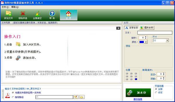 奇好PDF批量添加水印工具是一款為您的PDF文件添加水?。商砑游淖帧D片水?。┑拿赓M(fèi)軟件。