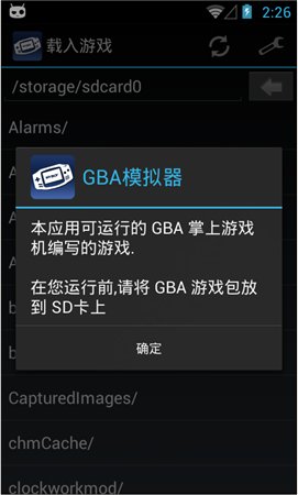 首次運(yùn)行軟件會(huì)提示您,這個(gè)軟件不包含任何游戲ROM,就是說(shuō)GBA游戲需要下載到SD卡上才能玩,這個(gè)軟件因?yàn)榘鏅?quán)的原因不提供游戲下載,但是我們可以直接上百度搜索GBA游戲即可。GBA游戲的格式是.gba,但是支持.zip格式的壓縮包,對(duì).rar格式的壓縮包支持不好,不能運(yùn)行可以解壓出其中的.gba格式文件即可