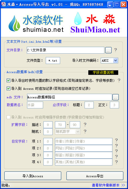 水淼Access導入導出器一款免費的txt和mdb互轉工具,將Access數(shù)據(jù)庫的記錄導出到文本文件,或將文本文件導入到Access數(shù)據(jù)庫記錄(可做文章入庫之用)。