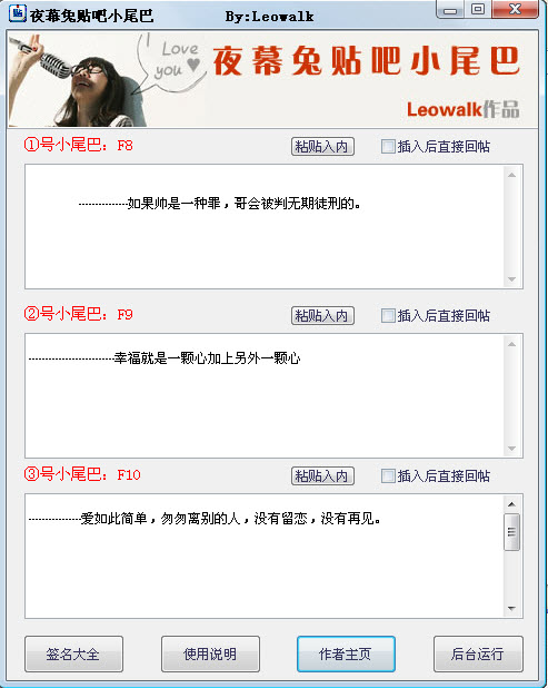 夜幕兔貼吧小尾巴是一款百度貼吧回復(fù)小尾巴工具。通過快捷鍵f8、f9、f10可以快速方便的設(shè)置貼吧小尾巴并支持立即回復(fù)、最小化后臺運(yùn)行。純綠色軟件。