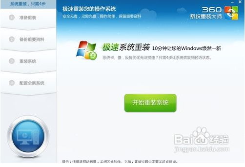 接下來(lái)我們啟動(dòng)360系統(tǒng)重裝大師。大家能夠看到,下圖中給出了重裝系統(tǒng)的4個(gè)步驟。我們點(diǎn)擊開始重裝系統(tǒng)。