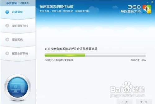 這時(shí)候它會(huì)檢測(cè)您是否符合安裝條件。提醒大家360系統(tǒng)重裝大師是不能把XP版本的系統(tǒng)裝成win7版本的。這點(diǎn)很不爽。