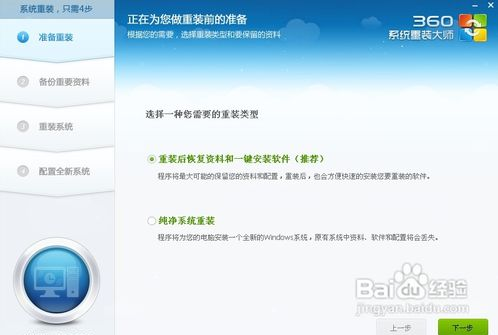 接下來(lái)該選擇重裝類型了??偣灿袃蓚€(gè)選擇,第一是重裝后恢復(fù)資料和一鍵安裝軟。官方推薦的是這種。但是我個(gè)人體驗(yàn)不是很好,重裝軟件的時(shí)候感覺很慢(不知道什么原因。)我個(gè)人建議用其他方法進(jìn)行備份。為了給大家演示,我選擇第一種。