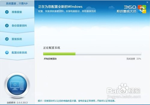 接下來(lái)根據(jù)提示就點(diǎn)下一步就好了,系統(tǒng)開始重裝了。剩下的就需要等待了。這個(gè)時(shí)候您可以喝杯咖啡。聽聽音樂,靜靜的等待它裝完吧,全程大概用時(shí),幾分鐘,這要根據(jù)您電腦備份資料的多少而定。