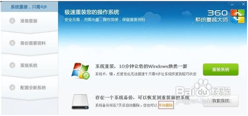如果發(fā)現(xiàn)重裝系統(tǒng)后您的C盤變小了。沒關(guān)系,這是因?yàn)?60系統(tǒng)重裝大師在您的C盤中進(jìn)行了一個(gè)備份。在7天內(nèi)您可以隨時(shí)恢復(fù)到重裝系統(tǒng)之前的狀態(tài)。如果您不打算恢復(fù)原來(lái)的狀態(tài)了可以點(diǎn)擊下圖中的手動(dòng)刪除選項(xiàng)將其刪除。