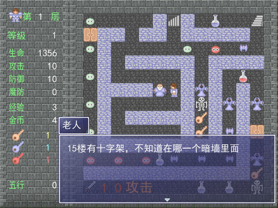 B 20F.左下對第一個石頭人按W,哈哈,變成綠色史來姆了解決它,打兩旁的6個骷髏(S,因?yàn)槟阌锌赡軙芰p半,不過中了也可以吃紅瓶子,但是麻煩啊,反正存就是了)吃6紅鑰匙,此時可以回去拿盾(在哪層給忘了,不好意思)拿完后回來,右下2雙劍和毒蝙蝠(S,中毒了要么吃綠瓶子,要么B 9F處花100元)開藍(lán)門拿鋤頭和血,把下樓梯口的黑色石頭人變成史萊姆(其實(shí)石頭人不讓你打是有道理的,因?yàn)樗姆罆c你的攻擊一樣高,雖然按D顯示是…,開始加防,總之防上600后能輕松解決它)B 21F.(買藍(lán)鑰匙)