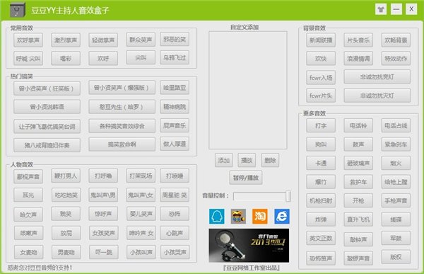 豆豆YY主持人音效盒子2013集合版是一款網(wǎng)絡K歌、網(wǎng)絡主持、MC喊麥、演出活動必備的音效輔助工具,能有效的帶動現(xiàn)場活動氣氛,使錄制的作品更加生動有趣。