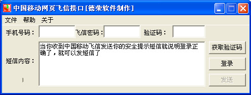移動(dòng)網(wǎng)頁(yè)飛信接口 1.0綠色版 移動(dòng)網(wǎng)頁(yè)飛信接口用于中國(guó)移動(dòng)通信開(kāi)通了飛信功能的用戶使用,用于自動(dòng)登錄網(wǎng)頁(yè)飛信并免費(fèi)向手機(jī)發(fā)送短信。移動(dòng)網(wǎng)頁(yè)飛信接口免安裝,自動(dòng)記憶用戶信息,一鍵登錄移動(dòng)飛信,簡(jiǎn)單易用,很方便的應(yīng)用到其它方面。