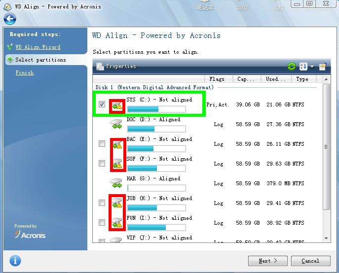 9,如果您的硬盤分區(qū)存在4K/扇區(qū)未對(duì)齊情形,則在相應(yīng)的分區(qū)圖片上出現(xiàn)黃色嘆號(hào),此時(shí)您可以在勾選相應(yīng)的分區(qū)進(jìn)行對(duì)齊操作。(不需要對(duì)齊的分區(qū),則無(wú)勾選框出現(xiàn))。勾選完畢后,點(diǎn)擊“Next”進(jìn)行下一步操作。