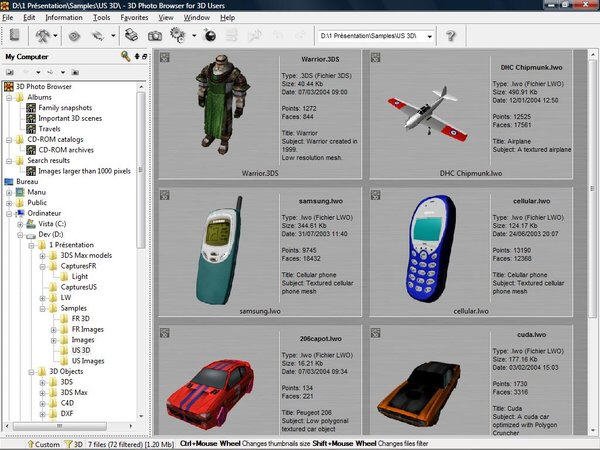 3D Browser是一套強大的2D及3D圖片文件瀏覽器。它會建立目錄,并包含了縮圖、關(guān)鍵自、作者資訊、以及評注。3D browser并且具有許多的功能,諸如檔案搜尋、目錄列印、幻燈片顯示功能、快速的應(yīng)用程式存取等。這套軟體并且能夠辨識psd、 tga、 jpg、 gif、 iff、 tiff、 bmp.......等2D檔案,以及3DS Max、 Lightwave、 Truespace、 3D studio、 Amapi等3D檔案。為了能夠快速的瀏覽你的檔案,這套軟體并內(nèi)建了一個強大的2D及3D瀏覽器。也能夠經(jīng)由瀏覽器來作檔案轉(zhuǎn)換的工作。它完美了結(jié)合視窗介面并擁有漂亮的圖形外觀。