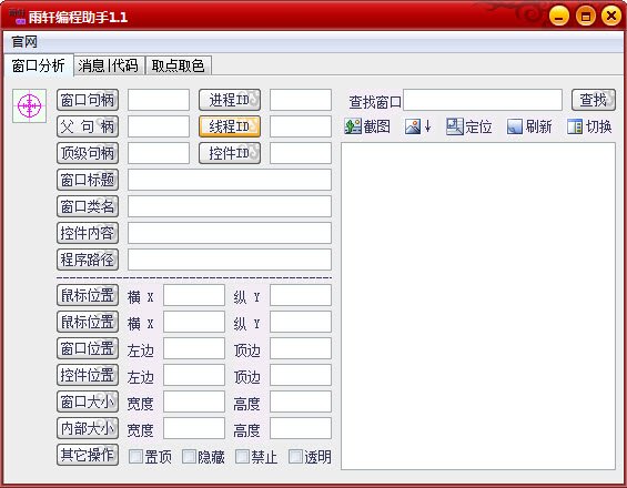雨軒編程助手是一款易語言編寫的編程輔助軟件,可以在朋友們編寫程序時,成為您得力的助手。雨軒編程助手 主要功能:1:窗口信息查詢 2:搜索窗口 3:api代碼生成 4:屏幕截圖 5:屏幕找色