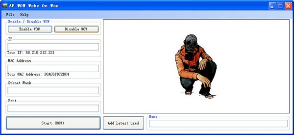 在廣域網(wǎng)的AP WOW喚醒的,你將可以保持您的Internet連接處于活動(dòng)狀態(tài)。只需按下“啟用WOW”按鈕,輸入的IP地址和MAC地址,子網(wǎng)掩碼和端口的電腦,你要啟動(dòng),然后點(diǎn)擊“開始WOW”。