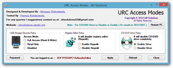 禁用USB和DVD(URC Access Modes) 1.0 綠色版 禁用USB和DVD(URC Access Modes)是一種簡單,方便的應(yīng)用程序,使您可以配置的接入方式為USB和CD / DVD驅(qū)動(dòng)器和注冊(cè)表編輯器功能。讓您的USB設(shè)備和DVD驅(qū)動(dòng)器的存取控制。此外,您可以啟用或禁用Windows注冊(cè)表編輯器,以避免不必要的更改注冊(cè)表。