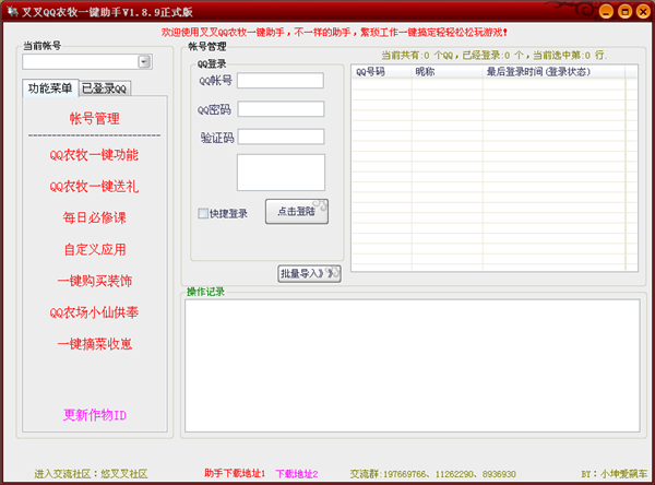 叉叉QQ農(nóng)牧一鍵助手是一款QQ空間農(nóng)牧場(chǎng)的輔助工具,具備QQ農(nóng)牧一鍵送禮、購(gòu)買(mǎi)裝飾、摘菜收崽等功能,使用該軟件,可以輕松一鍵搞定繁瑣的工作。