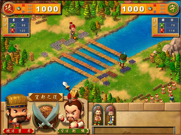 在前代中,每個主公都必需完成五個關(guān)卡才能統(tǒng)一天下;這次為了讓玩家能一次玩?zhèn)€過癮,每個主公都設(shè)計了十三個與眾不同的關(guān)卡,以及三個隱藏關(guān)卡,來考驗玩家的智慧。不管是扮演曹操、孫權(quán)或劉備,每個主公都必須帶領(lǐng)各自的武將,采取各自的策略,完成所有的挑戰(zhàn)。每個主公的關(guān)卡都充滿著小組成員的精心巧思,例如有些關(guān)卡中,僅能派遣文官出戰(zhàn),考驗玩家的應(yīng)變功力;有些關(guān)卡必經(jīng)要道上蓋滿敵人的箭塔,是要快步通過,還是打下箭塔我軍的傷亡才能最低呢?有些關(guān)卡中,東奔西走總是逃不出敵人的勢力范圍,只有花錢開通新路才能逃出生天。每一個關(guān)卡都有其特殊的戰(zhàn)略意義,上一關(guān)無往不利的策略,在這一關(guān)可能就行不通了。這些關(guān)卡不僅代表著游戲的豐富性,也產(chǎn)生了不同的游戲樂趣。