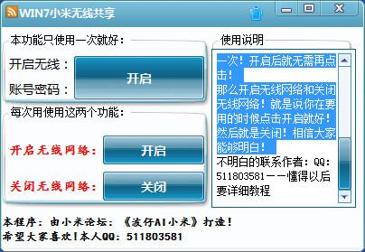 在使用本功能的第一個功能開啟后!請自己去設(shè)置網(wǎng)絡(luò)共享!設(shè)置好在使用其他兩個功能!上網(wǎng)就ok!默認帳號是《win7 ap wow!》密碼《12345678》