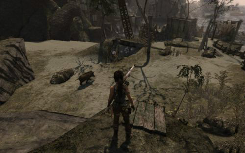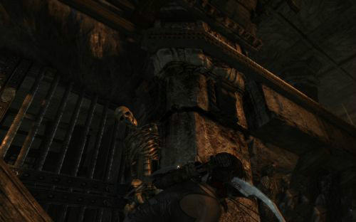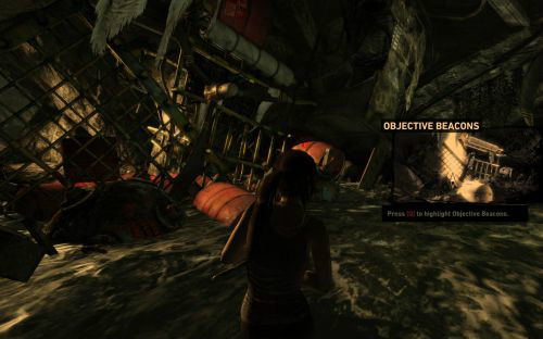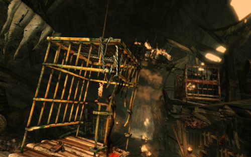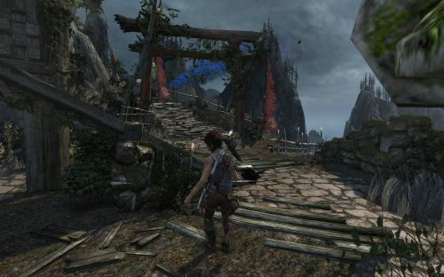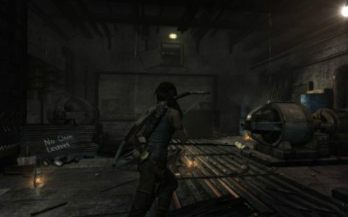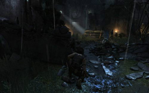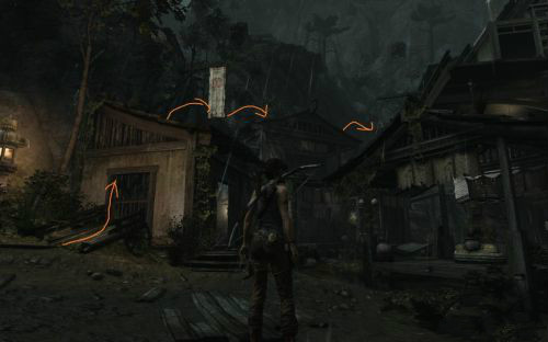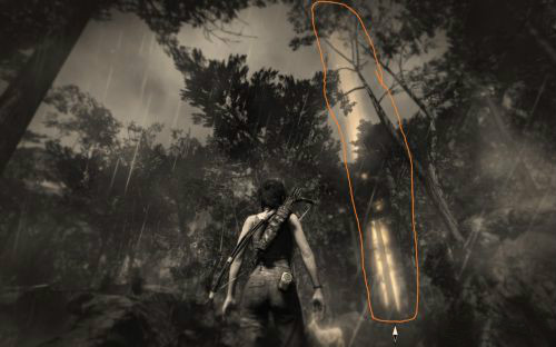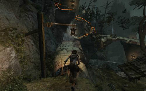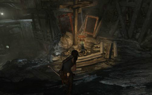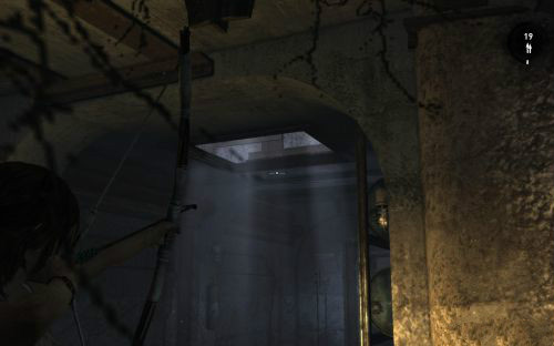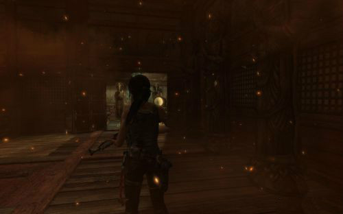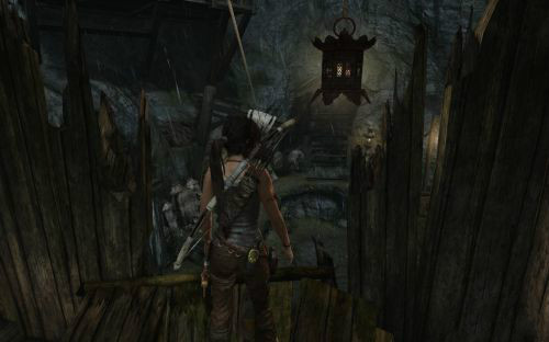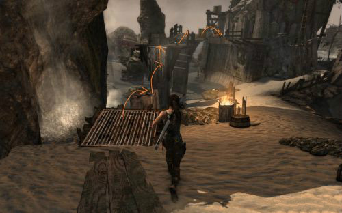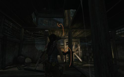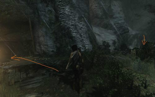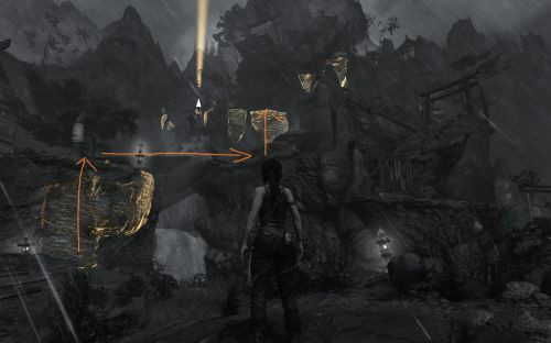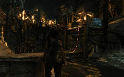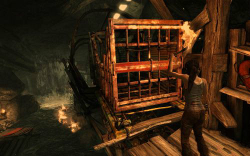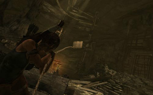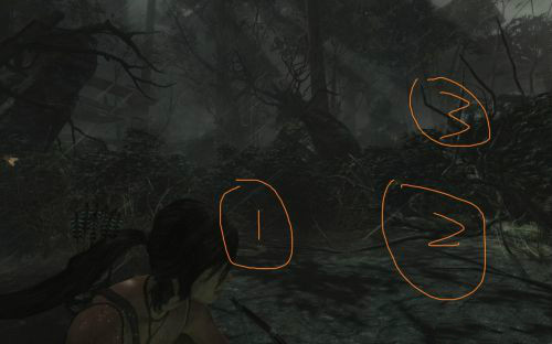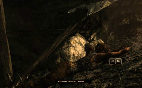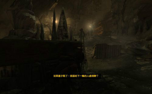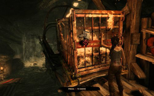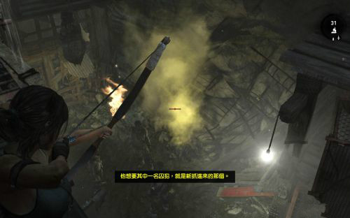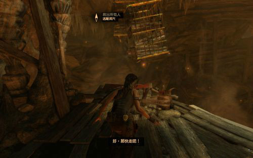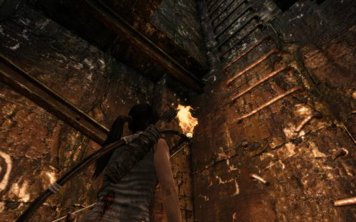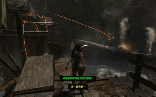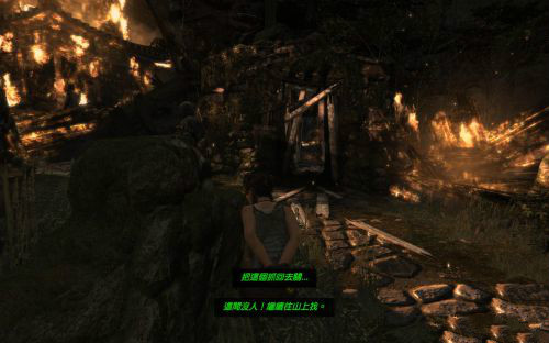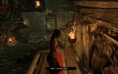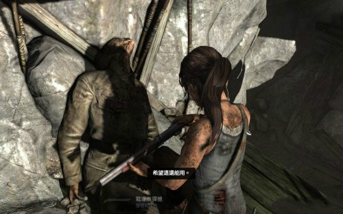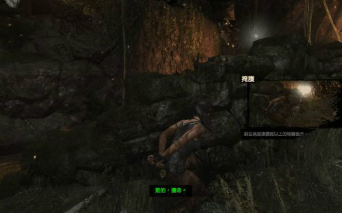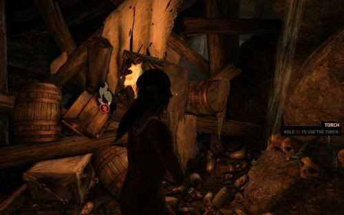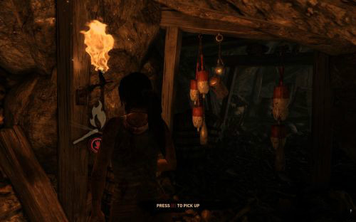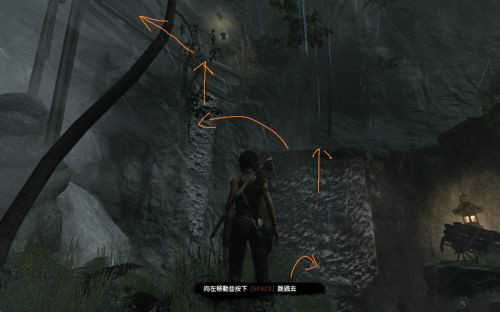 之后傷痕累累的勞拉蹣跚地走出洞穴尋找出路,沿途左手邊有火炬,可以按動作鍵E拾取。