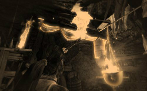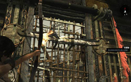 看到可行的道路之后來到左邊按空格攀上木架,在布條處按住E用火把點燃布條.