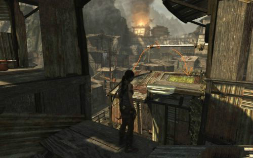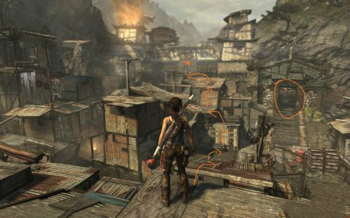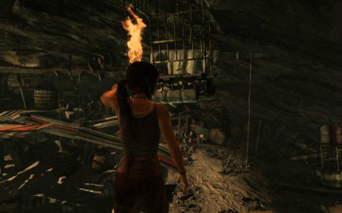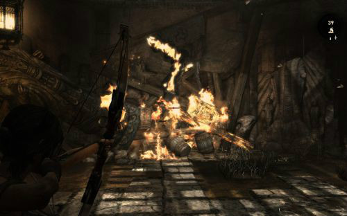 火勢會不斷蔓延至對面引燃油桶從而炸出一條生路.路出來以后勞拉可以爬上前方的木臺,