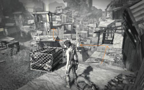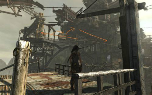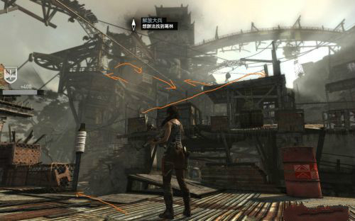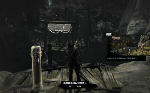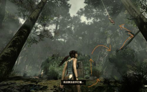 這里我們按照下圖指示爬到樹干上,然后趁尸體搖擺到我們身邊是伸手去拿弓