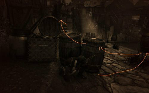 進去以后前進不久會看到一隊士兵通過,這時候蹲在木桶后面等他們經(jīng)過之后再前進可以避免戰(zhàn)斗,