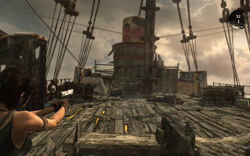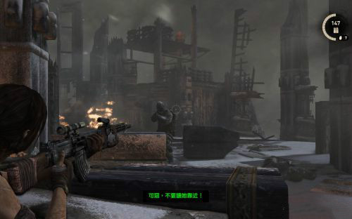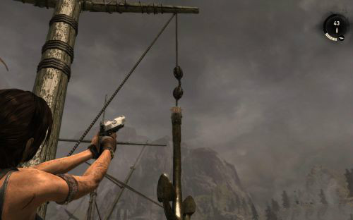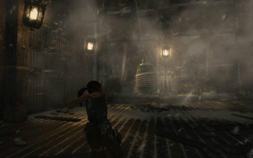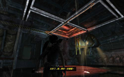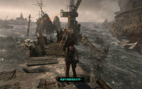 之后前行干掉兩個敵人乘繩索到另一半船身后會遇到被困的艾利克斯.勞拉利用鉤子把門上得障礙物勾走,