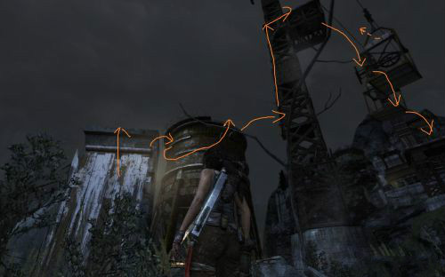 最后爬到上方巖壁之后往左爬.來到上方,之后直走搭建繩橋去到高地.到達高地之后按下圖方向爬到塔的上方.