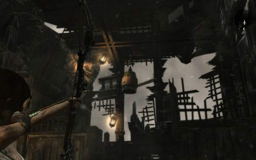 進入以后向上方發(fā)射繩索搭建繩橋.之后一路爬巖壁上去來到有大鐘的發(fā)現(xiàn)站在大門的另一半拉動大鐘讓其擺動撞開木門.