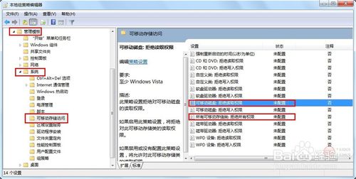 5.在組策略管事器窗口中,依次點(diǎn)擊“管理模塊”→“系統(tǒng)”→“可移動(dòng)存儲(chǔ)訪問(wèn)”,確保右側(cè)“可移動(dòng)磁盤(pán):拒絕讀取權(quán)限”和“所有可移動(dòng)磁盤(pán):拒絕讀取權(quán)限”兩項(xiàng)均被設(shè)置為“未配置”或“已禁用”。如果不是,則雙擊對(duì)應(yīng)項(xiàng),在彈出的窗口中勾選“已禁用”項(xiàng)并點(diǎn)擊“確定”即可。