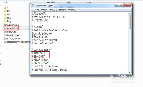 4.下載完成后,進(jìn)入量產(chǎn)工具的目錄,查看相應(yīng)的配置文件(如本經(jīng)驗(yàn)中的“AlcorMP.ini”文件)內(nèi)容,確?!癙ID”和“VID”信息與U盤(pán)芯片檢測(cè)工具所顯示的數(shù)據(jù)一致,如果不一致,建議對(duì)配置文件進(jìn)行修改)。