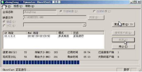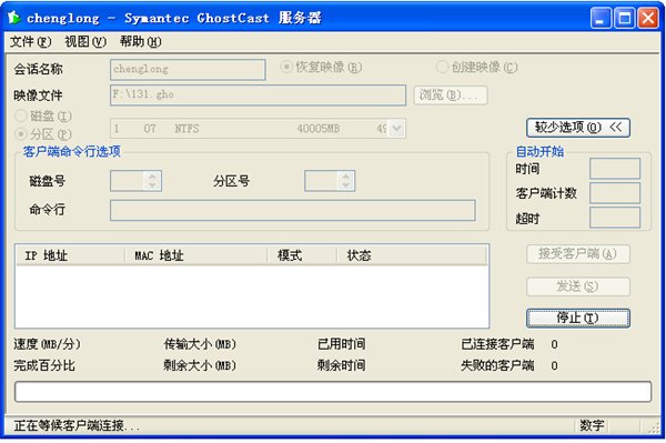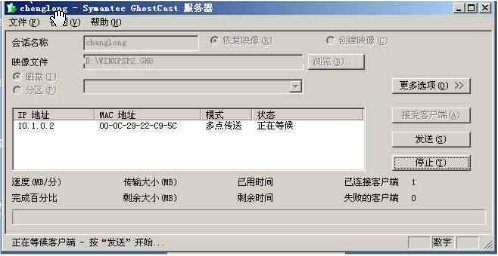 在出現(xiàn)以上界面后,表明客戶機已經(jīng)準備好,此時將所有客戶機設(shè)置BIOS后,使用網(wǎng)卡啟動到這個界面,我們就可以單擊服務(wù)器Ghost網(wǎng)克服務(wù)器里的“發(fā)送”按鈕實現(xiàn)網(wǎng)克了;