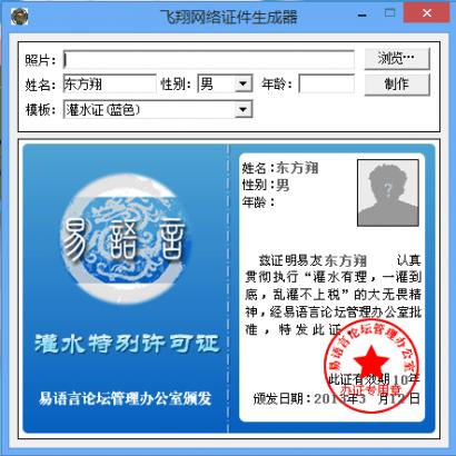 飛翔網(wǎng)絡(luò)證件生成器使用它可以制作各種網(wǎng)絡(luò)證件。如:處男證,忽悠證,世界首富證等,歡迎各大網(wǎng)友試玩。