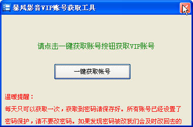 暴風(fēng)影音VIP帳號(hào)獲取工具可以幫你獲取暴風(fēng)影音的VIP賬號(hào),但有限制,每天只能獲取一次,
