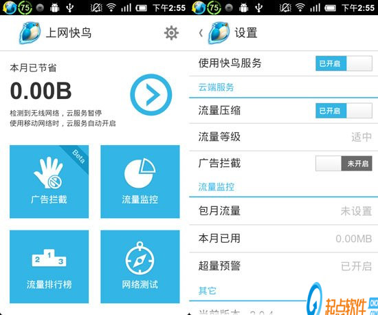 小編使用該應用的時候了解到,上網快鳥的云服務只能節(jié)省手機移動網絡環(huán)境下的流量,遇到WIFI環(huán)境會自動關閉?,F(xiàn)在開啟它的云服務功能,點擊“>”,或者在上網快鳥的“設置”菜單選擇“使用快鳥服務”,上網快鳥就可以在后臺運行監(jiān)控與節(jié)省流量的程序。
