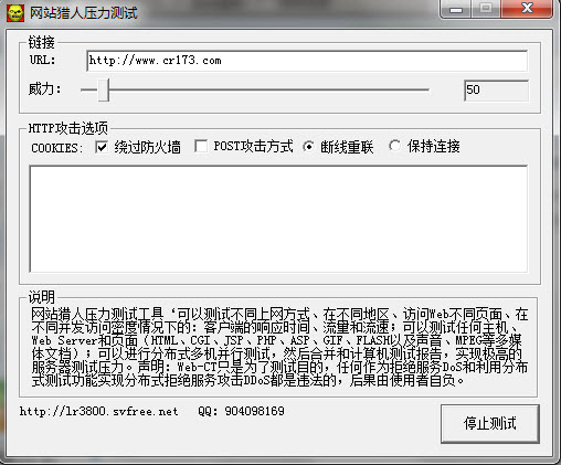 Web-CT只是為了測試目的,任何作為拒絕服務(wù)DoS和利用分布式測試功能實(shí)現(xiàn)分布式拒絕服務(wù)攻擊DDoS都是違法的,后果由使用者自負(fù)。