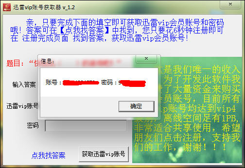 該軟件只有在前往網(wǎng)頁花費6秒鐘注冊后即可看到軟件答案,便可使用我所提供的vip4迅雷會員賬號。大家呢,得到了下載的樂趣,而我呢,也有了繼續(xù)續(xù)費會員的資金,這是多么一舉兩得的事??!