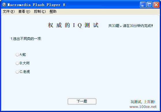 權(quán)威的IQ測試包含了一套國內(nèi)經(jīng)典的iq測試題,共33題,請?jiān)?0分鐘內(nèi)完成,做完之后會給出結(jié)果。不要猜題,不知道的不要作答,不可以求助別人,否則即使你做完了這些iq測試題,結(jié)果也會不準(zhǔn)確的。