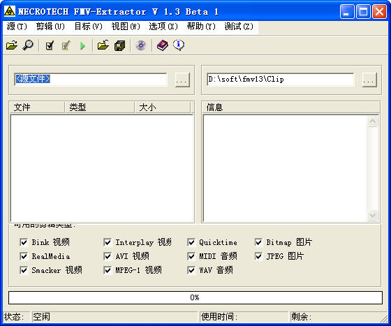 現(xiàn)在大多數(shù)游戲軟件的視頻、音頻及圖片都打包成了一個大文件,F(xiàn)MV-Extractor 就可以從這些文件中分離出可以單獨播放的文件。能夠分析有avi、wav、bink、jpg、bmp、realmedia...等等格式。