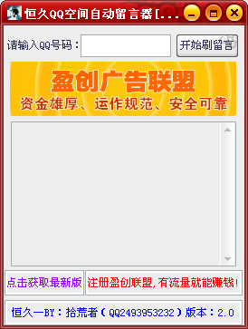 恒久QQ空間自動(dòng)留言器 2.0.1 綠色版 恒久QQ空間自動(dòng)留言器完全傻瓜式操作,開(kāi)啟軟件后,直接輸入QQ號(hào),即可開(kāi)始自動(dòng)刷留言,本軟件綠色安全,無(wú)需小號(hào),無(wú)需驗(yàn)證碼,即可簡(jiǎn)單使用,趕緊下載體驗(yàn)吧。