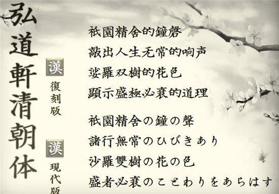 弘道軒清朝體是1875年神崎正宜創(chuàng)立的弘道軒所發(fā)表的楷書活字字體。在1881年被《東京日日新聞》選定為正文用字。字體端莊遒勁,既存有江戶時代的遺風,又開啟了明治時代的嶄新氣象。弘道軒清朝體在一百三十余年后的今天實現(xiàn)了數(shù)字化,并分為遵照原字模制作的復刻版,以及根據日本新字體規(guī)范修改的現(xiàn)代版兩個版本。自此之后,它必將歷久彌新,在漢字史上書下濃墨重彩的一筆。