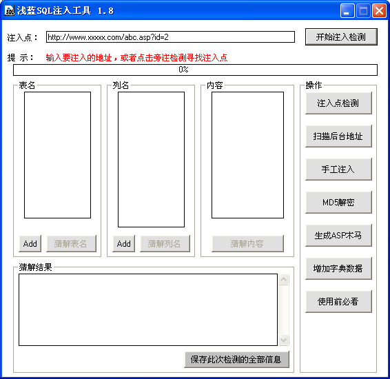 注入點(diǎn)檢測、掃描后臺(tái)地址、手工注入、MD5解密、生成ASP木馬、增加字典數(shù)據(jù)。