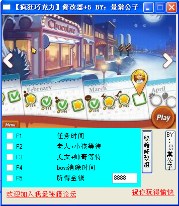 瘋狂巧克力是以經(jīng)營一家巧克力店為主題的游戲,本補(bǔ)丁由MJ修改組提供,可以修改任務(wù)時間、客人等待時間延長、金錢無限等五項(xiàng)功能