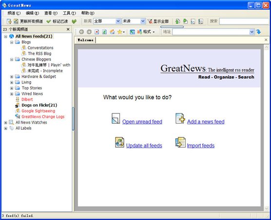 GreatNews,一款好用的RSS新聞閱讀器,速度超快,特別針對大量頻道同步更新而設(shè)計。GreatNews是一個市場占有率最大的rss客戶端閱讀器.